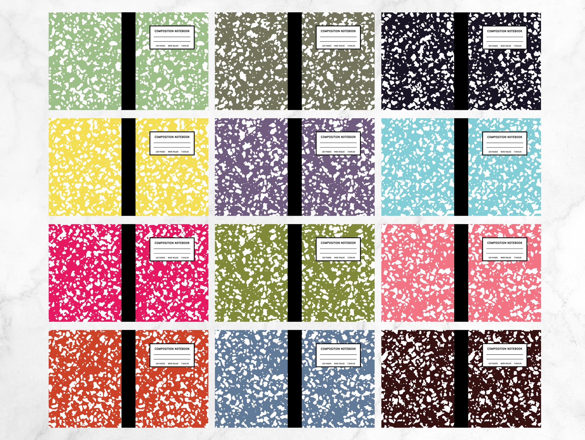- 12 Professionally designed Composition Notebook interiors
