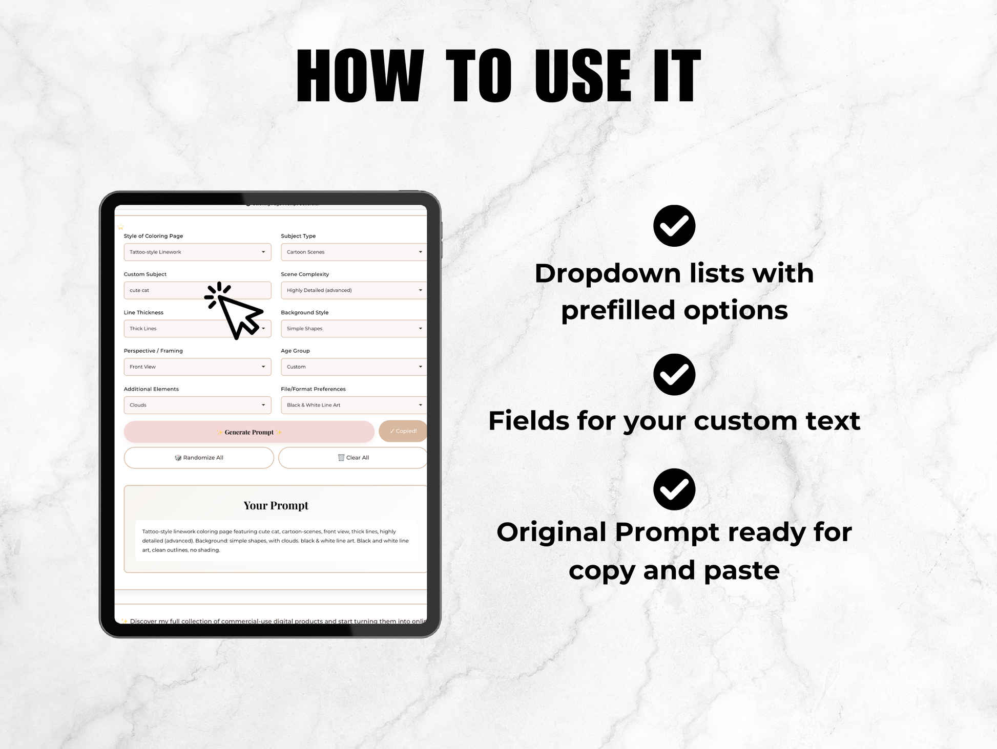 - Perfect for All Styles & Audiences: Create prompts for kawaii characters, mandalas, fantasy scenes, florals, animals, intricate adult coloring pages, simple kids’ outlines, doodles, geometric patterns, and more.