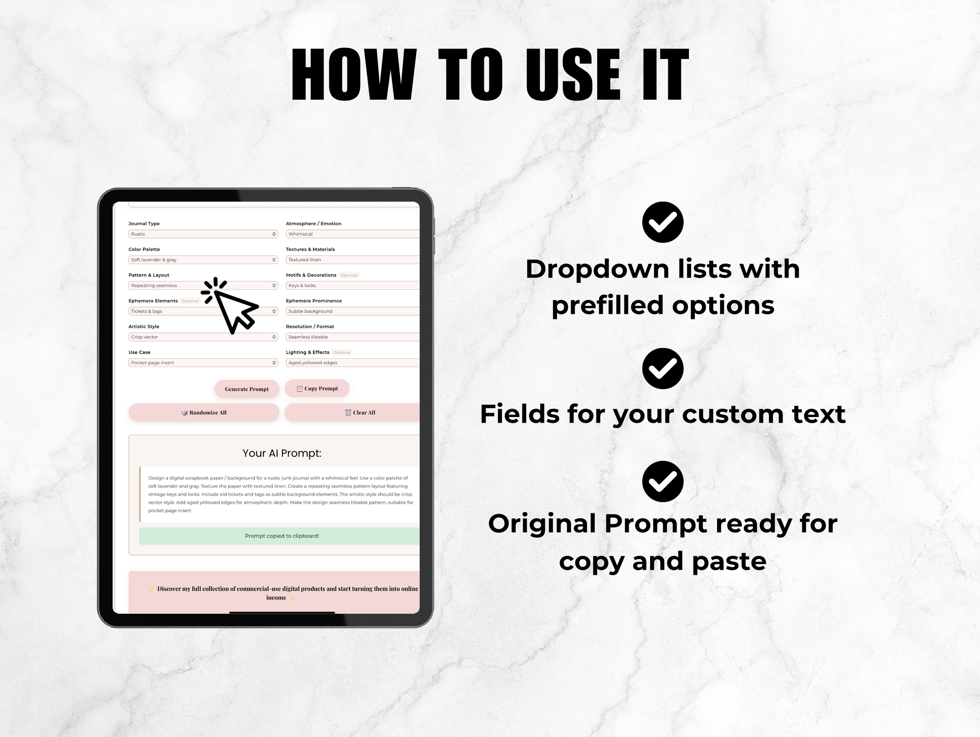 - Perfect for Vintage & Eclectic Styles: Build prompts for grunge, botanical, collage, ephemera, shabby chic, retro, celestial, handwriting layers, and more.